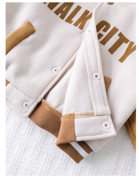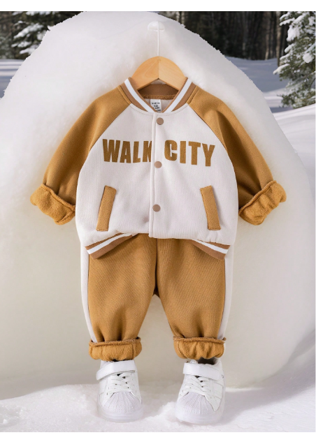 Give your little one a sporty, standout look with this 2-piece baby boys outfit, featuring a soft knit raglan sleeve baseball-style jacket and matching elastic cuff pants. With its bold contrast letter print and comfy fit, this set is perfect for active days, cool weather, and everyday wear. Baseball-Inspired Jacket: Classic round neck with raglan sleeves and a modern letter print for a playful, athletic vibe. Soft Knit Fabric: Cozy and breathable for all-day comfort. Elastic Cuff Pants: Flexible fit that moves with your baby, great for crawling, playing, or lounging. Stylish Contrast Design: Eye-catching color combos and prints add a fun touch to their outfit. Easy to Wear: Perfect for daycare, park outings, or casual family time. This set is a perfect mix of style and function—keeping your baby boy warm, comfy, and cute on every adventure. Available size 12-18 Months Fabric 100% polyester