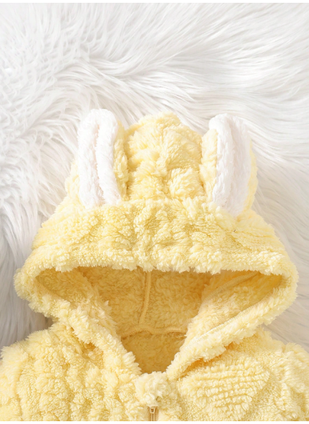 Turn up the cuteness with this irresistibly cozy hooded jumpsuit, designed with adorable rabbit ears for your baby girl! Made from ultra-soft plush material, this one-piece is perfect for keeping your little one warm and snug during chilly autumn and winter days. The hood adds extra warmth, while the full-length design ensures complete coverage and comfort. Whether for indoor cuddles or outdoor strolls, this jumpsuit combines warmth, style, and playful charm. Features: Adorable hood with floppy rabbit ears Made from soft, plush fabric for extra warmth Long sleeves and full-length legs for full coverage Easy zipper or snap closure for quick dressing Perfect for: Fall & winter outings, photos, and cozy days at home Available size : 12-18 Months Fabric: 100% polyester