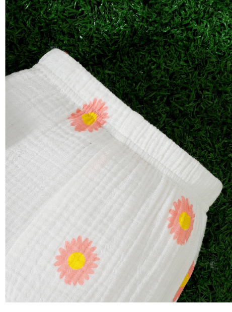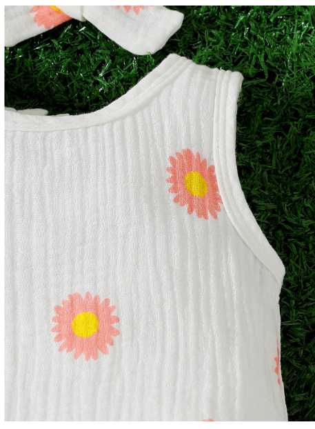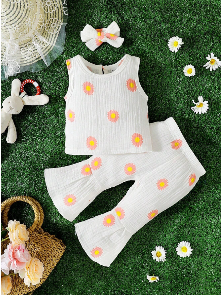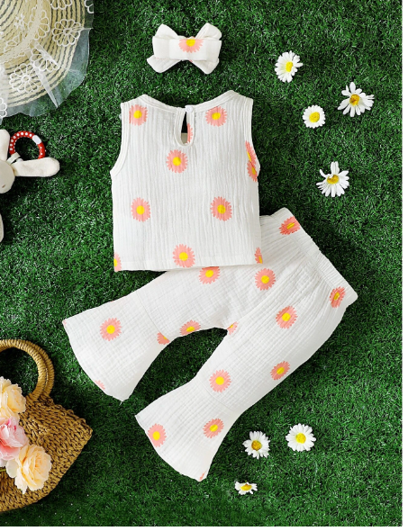 Brighten up your baby girl’s wardrobe with this adorable 2-piece outfit, featuring a charming floral print tank top and trendy flare leg pants. Made from soft, breathable fabric, this set is perfect for warm-weather playdates, outings, or photo moments. The sleeveless top keeps her cool and comfy, while the flared pants add a touch of retro-inspired style for a fun, fashionable look. Features: 2-piece set: floral tank top + coordinating flare leg pants Lightweight and breathable fabric for all-day comfort Sleeveless design for cool, easy movement Flared pants for a trendy and playful silhouette Ideal for summer days, family outings, or casual events Stylish and sweet, this outfit brings floral flair and everyday comfort together in one adorable set! Available size 18-24 Month Fabric 100% cotton