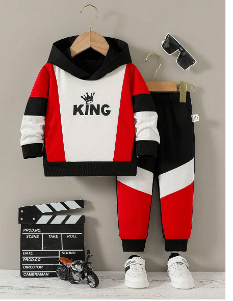 Your little king deserves a look that’s as bold and cool as he is! This 2-piece hoodie and sweatpants set features a trendy color block design and standout "KING" letter print, perfect for making a stylish statement. Made with soft, baby-friendly fabric, the hoodie sweatshirt keeps him cozy, while the elastic waist sweatpants ensure a snug and comfy fit. Ideal for playtime, outings, or just lounging in royal style. Key Features: Bold "KING" letter graphic for a standout look Stylish color block design adds a modern touch Soft, breathable fabric gentle on baby skin Elastic waistband for comfort and easy changes Perfect for casual days, photo ops, or gifting Fit for a little king—this set combines comfort with serious style! Available size 9-12 Months Fabric 100% polyester