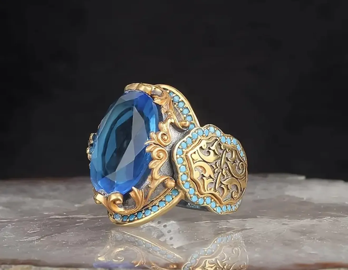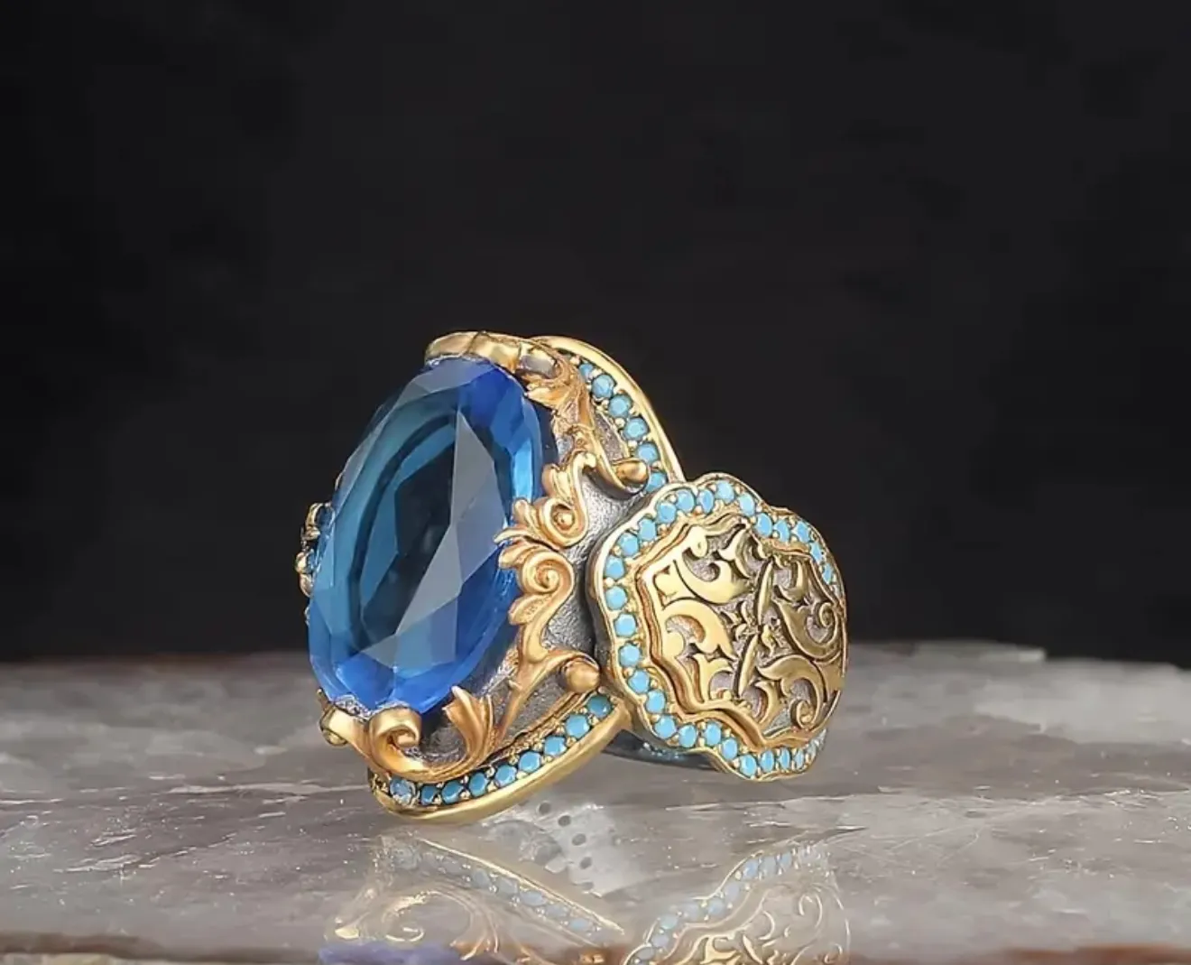 Turkish Design Blue Sapphire Handcrafted Ring - 1pc Vintage Style with Golden Plating, Synthetic Stone Setting, Single Piece Gift Jewelry for Men Delivery $6.70 overnight shipping $9.50 rural
