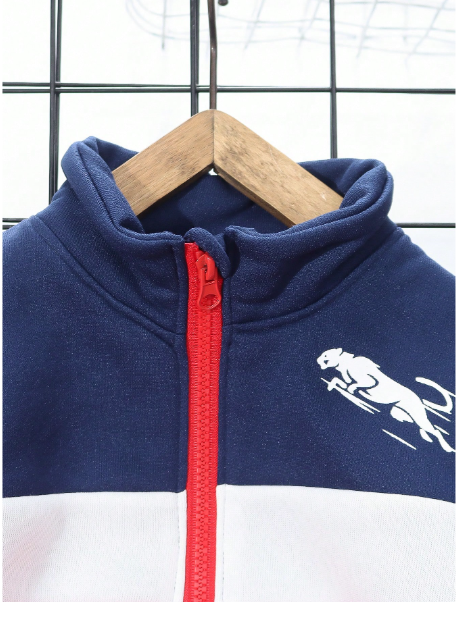 Let your little one stand out in style with this bold and trendy 2-piece set! Featuring a zip-up hoodie with a cool tricolor design and playful leopard print accents, paired with matching long pants, this outfit blends sporty energy with street-chic flair. Made from soft, breathable fabric, it offers all-day comfort and a relaxed fit—perfect for active boys who love to move in style. Features: Includes: 1 zip-up hoodie + 1 pair of matching long pants Eye-catching tricolor design with fun leopard print details Sporty street-style with a stylish twist Soft, breathable material for comfort and ease Perfect for: Casual wear, outdoor play, or trendy everyday outfits Available size : 6 Years Fabric:100% polyester