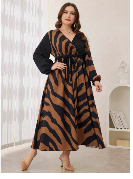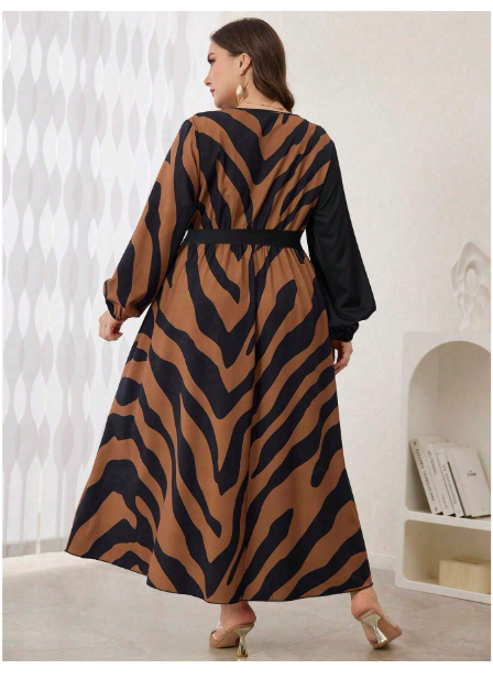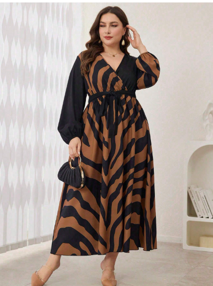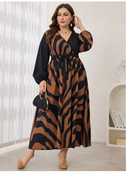 Unleash your inner fashionista with this bold and elegant Crossed Collar Zebra Print Midi Dress. Featuring a unique crossed neckline, striking zebra print splice design, and a flattering cinched waist, this dress is made to stand out with effortless sophistication. The midi length offers a refined silhouette, while the mix of solid and animal print creates a modern, eye-catching contrast. Perfect for everything from brunch dates to evening events, this dress balances edgy style with feminine charm. Key Features: Stylish crossed collar neckline for a modern touch Bold zebra print splice for standout appeal Waisted design to highlight your silhouette Midi length for a chic and versatile look Soft, breathable fabric for all-day comfort Ideal for day-to-night wear, events, or casual glam Pair with heels or ankle boots and simple accessories for a confident, fashion-forward look. Available size 4XL Fabric 95% polyester, 5% Elastane