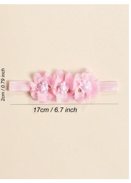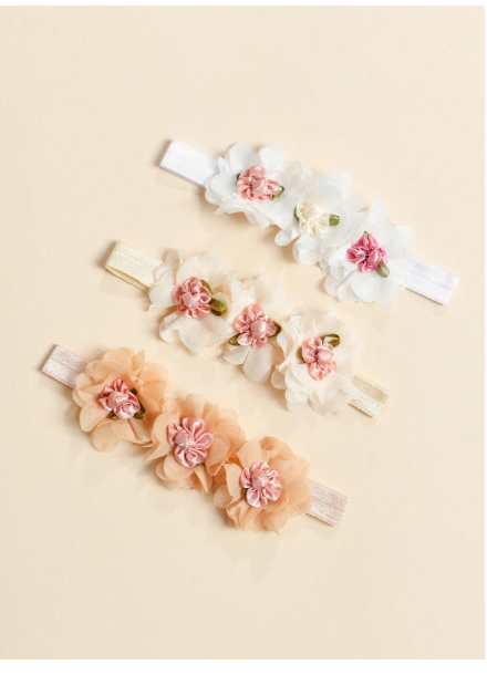 Add a delicate touch of charm to your little one’s look with this 3-piece set of lace flower elastic headbands. Each headband features a beautifully crafted lace flower on a soft, stretchy band designed to fit comfortably on newborns and infants without leaving marks. Perfect for everyday wear, special occasions, or photoshoots, these headbands bring a hint of vintage elegance while keeping your baby cute and comfy. Features: Set includes 3 lace flower headbands in assorted designs/colors Soft, stretchy elastic band – gentle on baby’s delicate skin Elegant lace flower detail adds a timeless, feminine touch Lightweight and comfortable for all-day wear Ideal for newborn photography, birthdays, or baby shower gifts A must-have accessory set for your little princess—graceful, stylish, and made with love. Available size - one size Fabric 95% polyester , 5% spandex