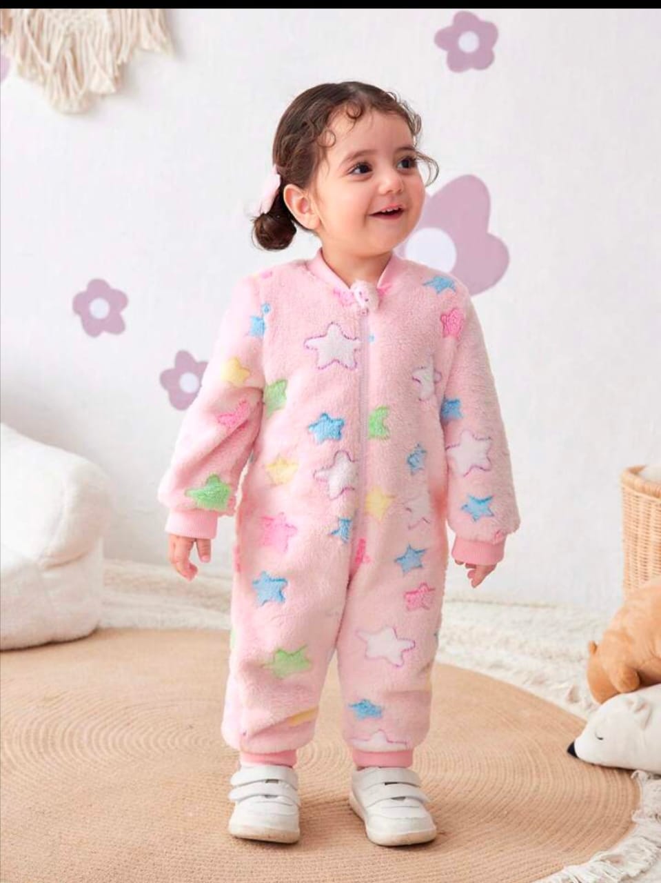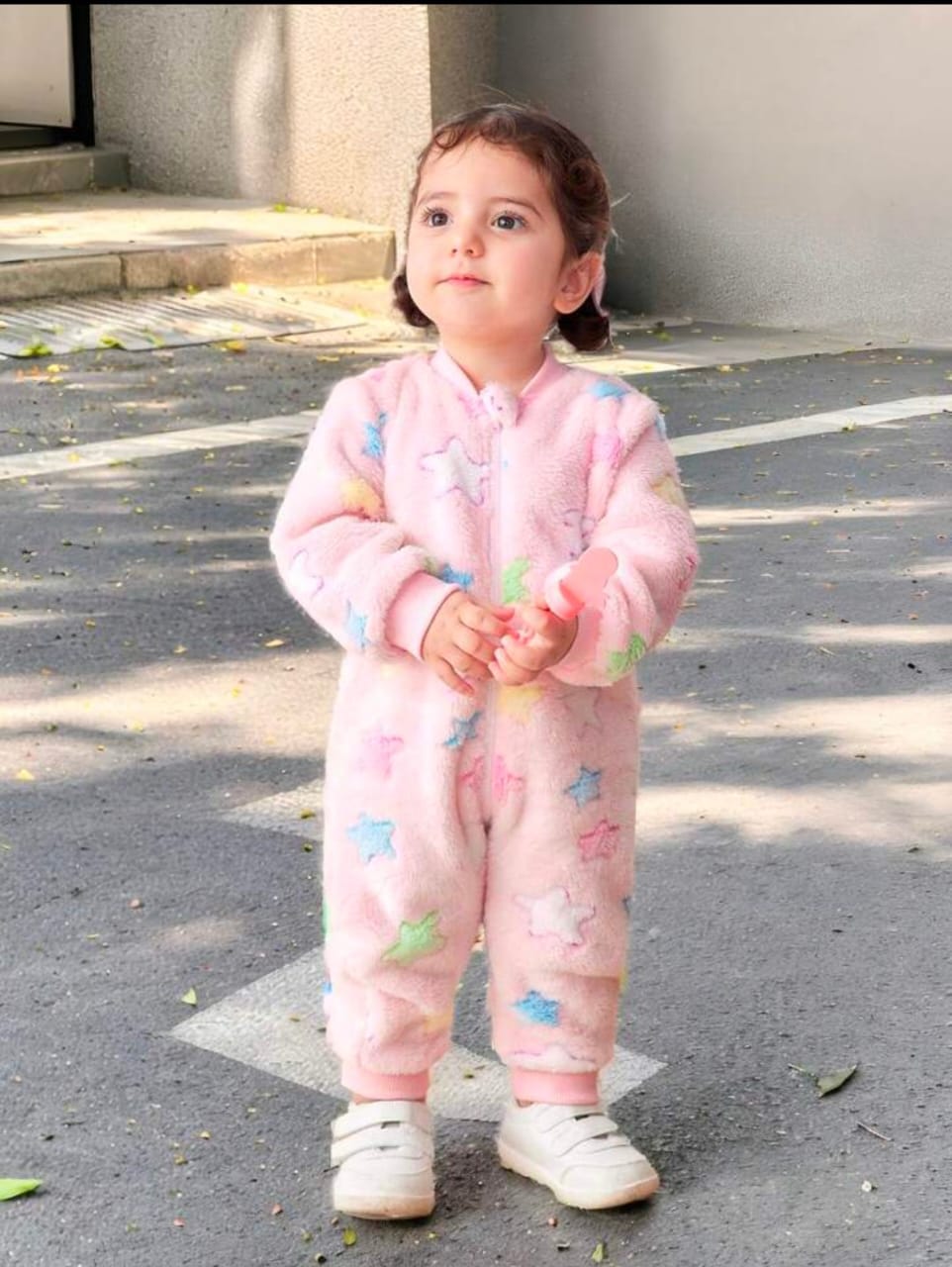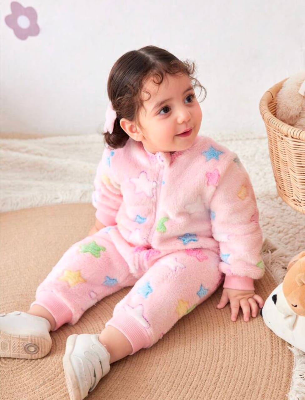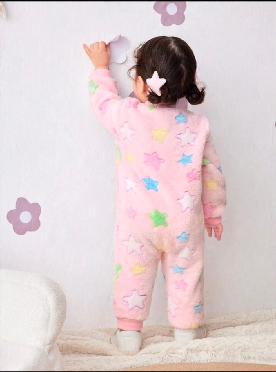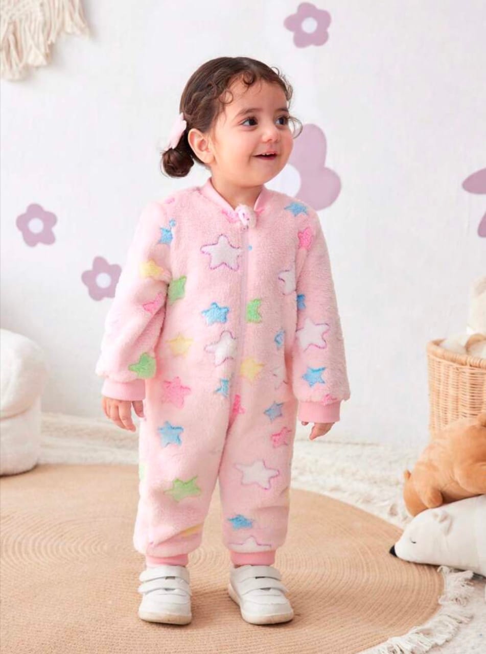 Wrap her in warmth and cuteness with this Newborn Baby Girl Thermal Fleece Romper, featuring a playful colorful star print that’s as bright as her smile. Made from ultra-soft thermal fleece, this one-piece is designed to keep your little star cozy and comfortable during colder days. The full-length design and easy snap closures make dressing and diaper changes quick and fuss-free. Perfect for naps, playtime, or chilly outings, this romper combines warmth, style, and everyday practicality. Key Features: Soft thermal fleece fabric for ultimate warmth and comfort Adorable colorful star print adds a fun, cheerful touch Snap-button closure for easy dressing and diaper changes Full-length coverage to keep baby snug from head to toe Ideal for fall and winter wear, lounging, or as a cozy layering piece Available size 0-1 Month Fabric : 100% polyester
