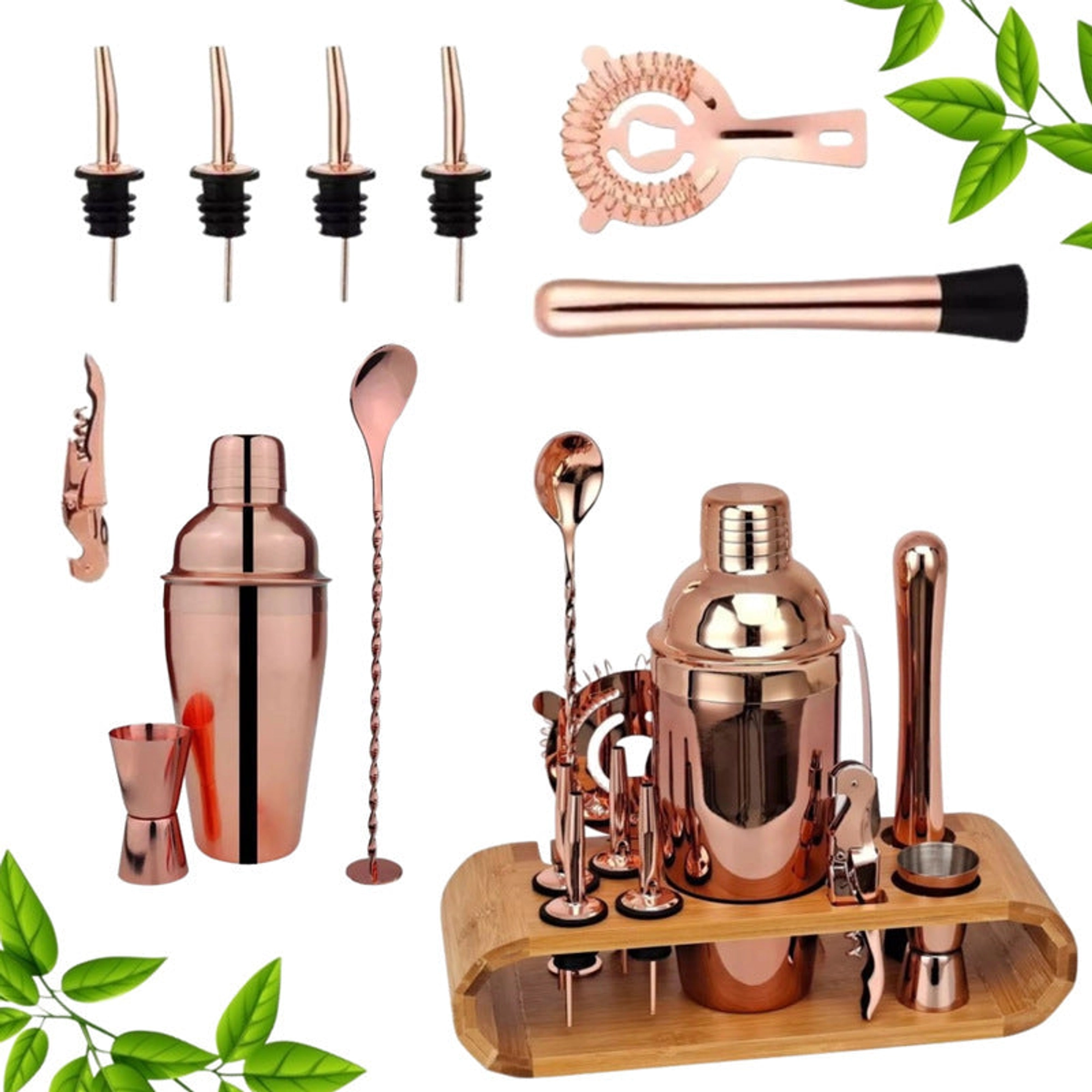 Elevate your cocktail crafting experience with our stunning Cocktail Shaker Set in a luxurious rose gold finish. This all-inclusive set is not only a perfect blend of style and functionality but also comes beautifully packaged in an elegant gift box, making it an ideal present for cocktail enthusiasts or a tasteful addition to your home bar. Each piece is carefully designed to provide ease of use while adding a touch of glamour to your mixology adventures. The chic ribbon, available in either black with shimmering gold or silver font, enhances the sophistication of this delightful gift set, ensuring itโs as appealing to the eyes as it is to the taste buds. โจ Features: Elegant Rose Gold Finish: Adds a touch of luxury to your cocktail-making experience. Beautifully Designed Gift Box: Perfect for any occasion, making it a thoughtful gift choice. ๐ Complete Cocktail Set: Includes all essential tools for crafting cocktails, ensuring you have everything you need. ๐ธ Chic Ribbon Options: Available in black with gold or silver font, elevating the setโs elegance. ๐ Stylish & Functional: A perfect addition to your home bar for both beauty and practicality. ๐น Perfect for anyone who loves mixing drinks in style, this set makes every cocktail a celebration.
