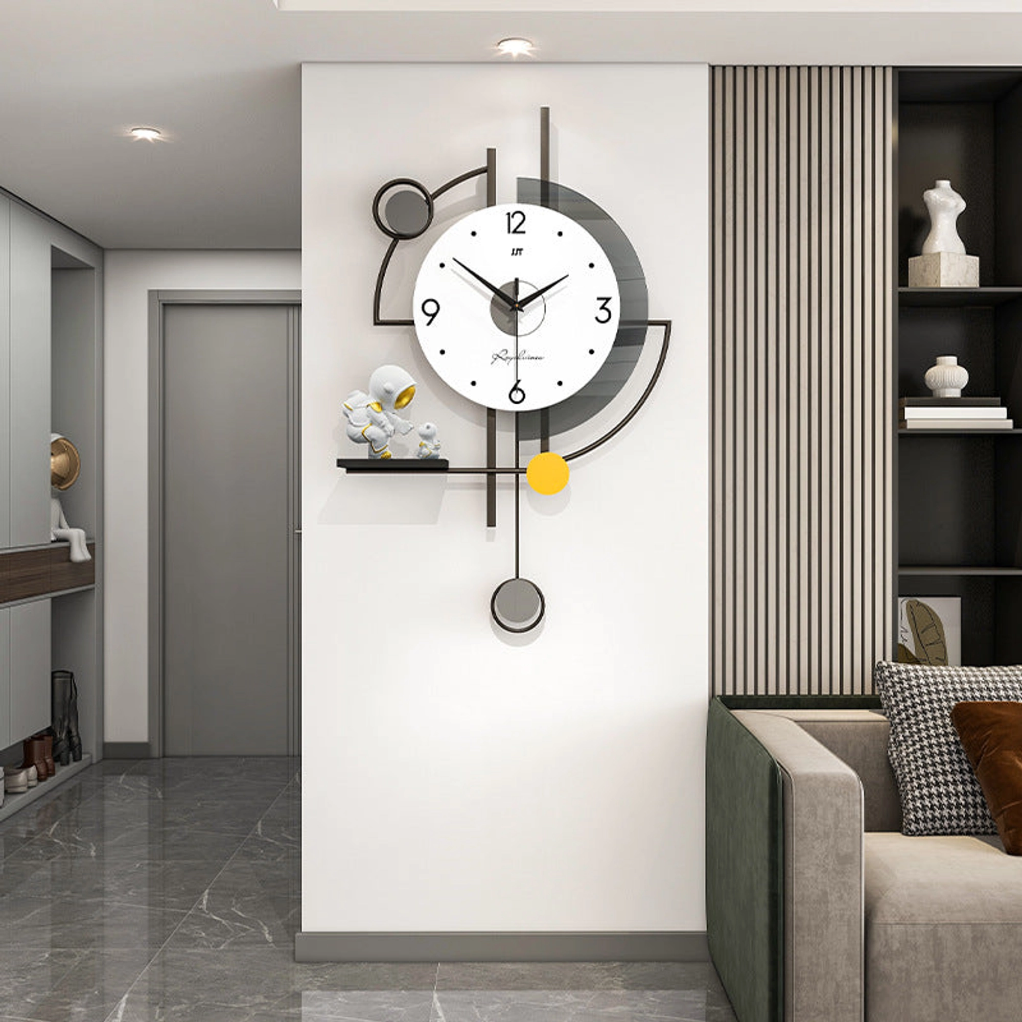Enhance your modern interiors with the Deer Silhouette Wall Clock, a minimalist masterpiece combining functionality and art. The white clock face features black Arabic numerals (12, 3, 6, 9), sleek black hands, and a subtle "Royalines" cursive branding beneath the 6. Surrounding the clock is a curved grey-toned semi-circular panel with black geometric accents, including a vertical bar, curved lines, and a delicate deer silhouette on the left. Complementing the design are three decorative circles in grey and gold, adding subtle elegance. Perfect for contemporary spaces with a clean, sophisticated aesthetic. Key Features: Modern Minimalist Design: Geometric shapes and clean lines exude contemporary style. Elegant Deer Silhouette: Adds a unique, artistic touch to your decor. Functional and Readable: Black Arabic numerals and hands ensure easy time-telling. High-Quality Materials: Made with iron, MDF, and acrylic for durability. Neutral Color Palette: Black, white, grey, and gold blend seamlessly into any decor. Additional Information: SIZE: 42*74 CM Material: Iron, MDF. Package Includes : Wall Clock shown in the picture. Note: Actual color may differ a little from the photos.