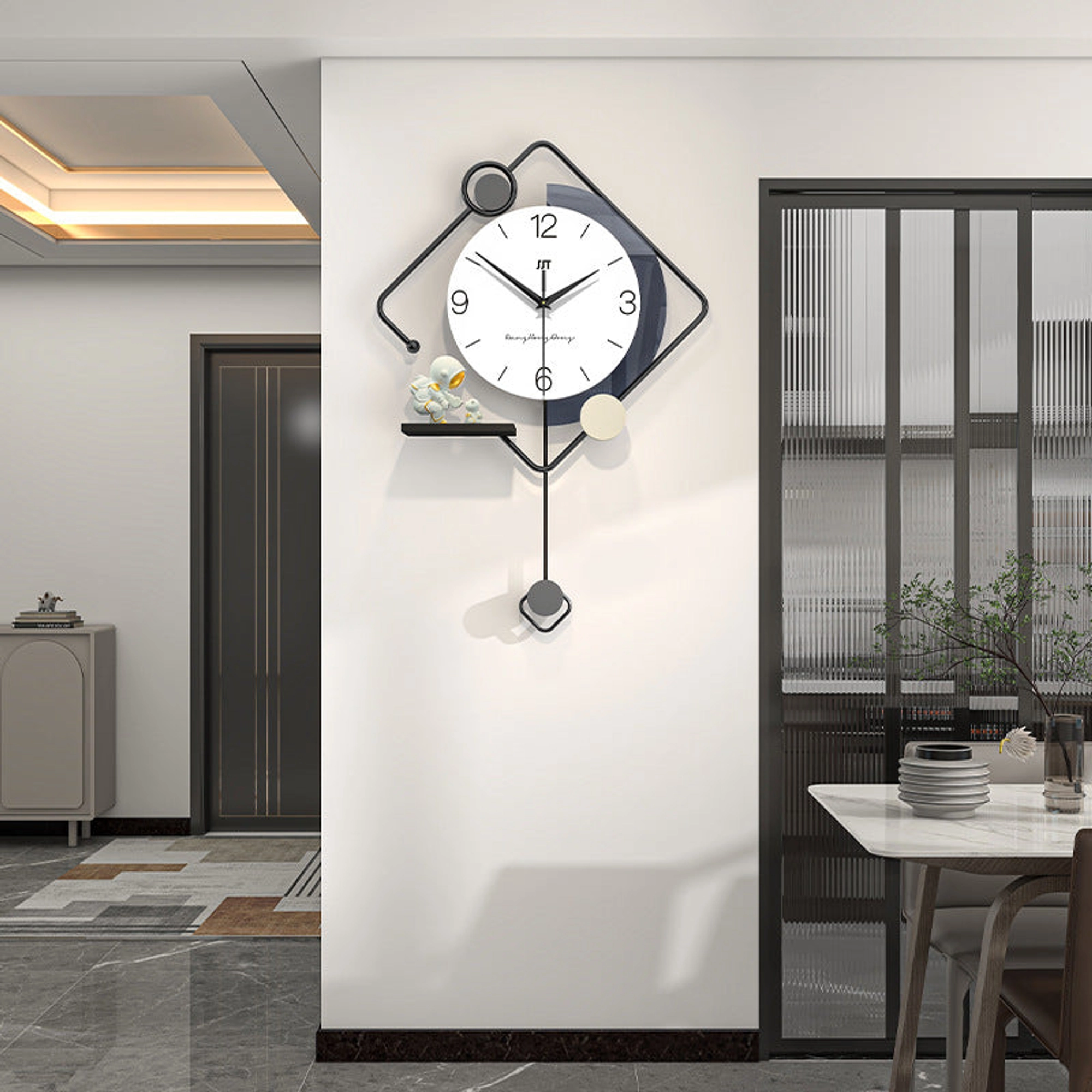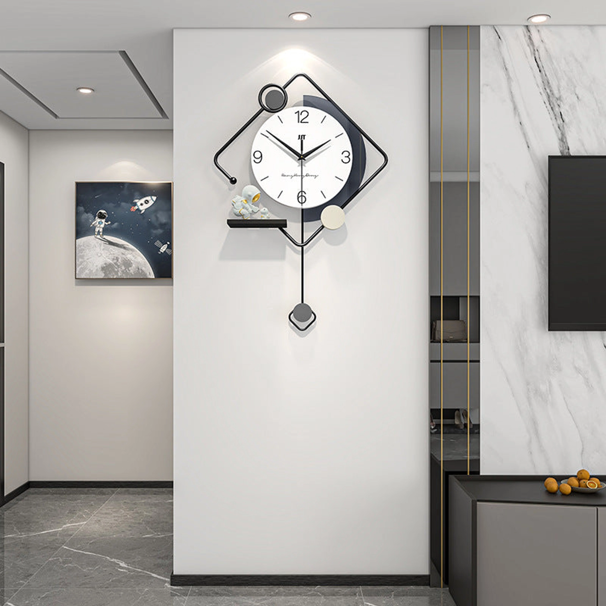 Infuse a sense of wonder and modernity into your space with the Modern Geometric Wall Clock, featuring a unique design that blends minimalist aesthetics with playful astronaut figurines. The clock's round white face offers a clean and simple design, with black Arabic numerals marking the hours and black hour and minute hands providing a timeless appearance. The clock face is set within a black metal frame that forms a diamond or kite shape, creating a striking visual contrast. A dark grey-brown section partially obscures the face, possibly made of glass or acrylic, adding depth and intrigue. Two small pale yellow-beige circles are seamlessly integrated into the frame, adding visual interest and a subtle pop of color. Beneath the clock face, a small black shelf holds two astronaut figurines: one a white-suited astronaut with gold accents and the other a smaller, companion-like figure. This playful, whimsical touch adds character and imagination to the piece. To complete the design, a long black metal rod extends downward from the clock face, ending in a dark grey circle encased in a miniature black diamond frame for a refined touch. This modern wall clock combines functionality and design with a hint of charm, making it perfect for contemporary spaces, living rooms, or even children’s rooms. The calm, clean color palette of black, white, and pale grey makes it a versatile addition to various interior styles. Key Features: Modern & Minimalist: Geometric black metal frame with clean, simple design. Whimsical Astronaut Figurines: Adds a playful, imaginative element to your space. Sleek & Functional: Provides both timekeeping and decorative appeal. High-Quality Build: Crafted from durable iron, MDF, and acrylic materials. Perfect Size: Dimensions of 36*54 CM make it ideal for various wall spaces. Additional Information: SIZE: 36*54 CM Material: Iron, MDF, Acrylic. Package Includes : Wall Clock shown in the picture. Note: Actual color may differ a little from the photos.