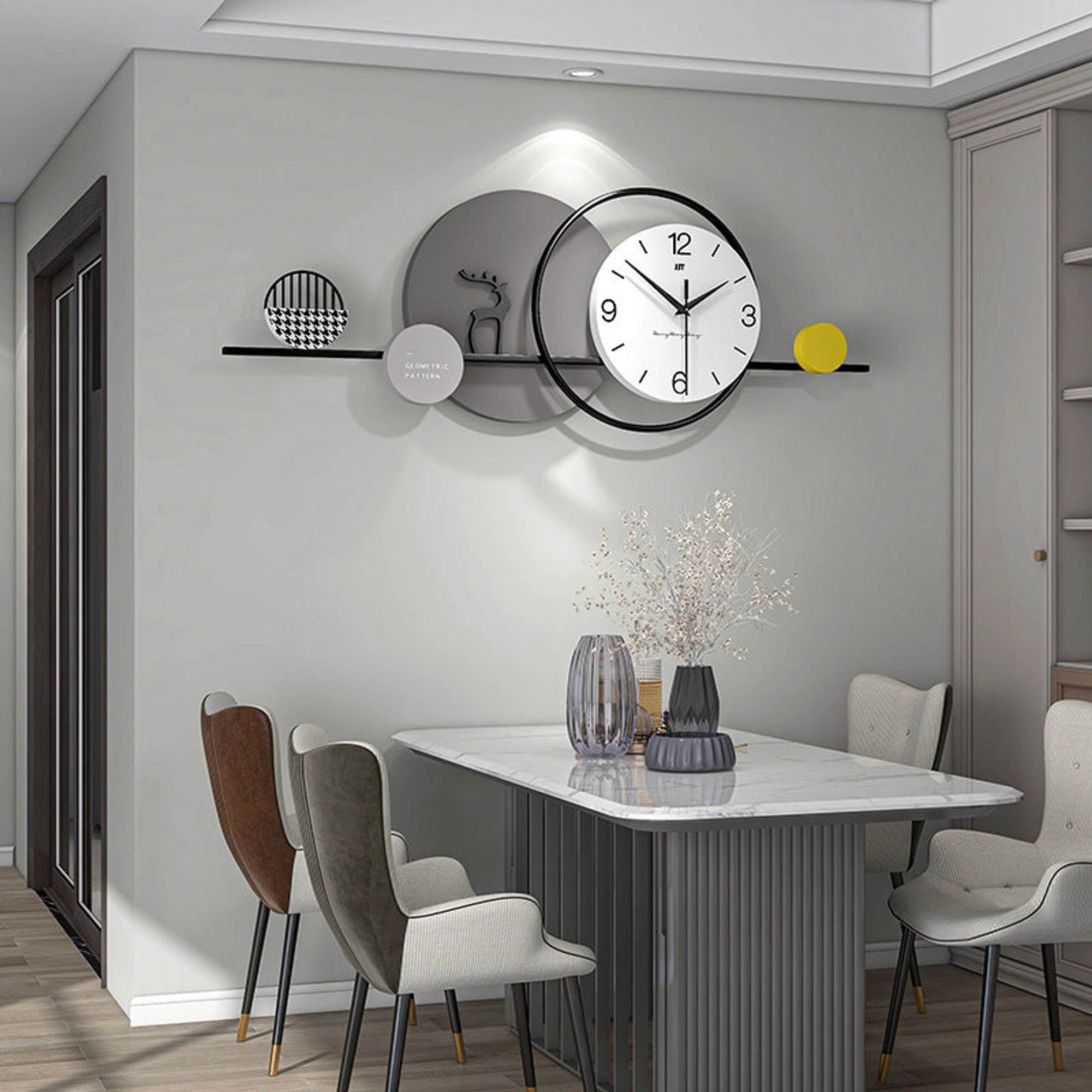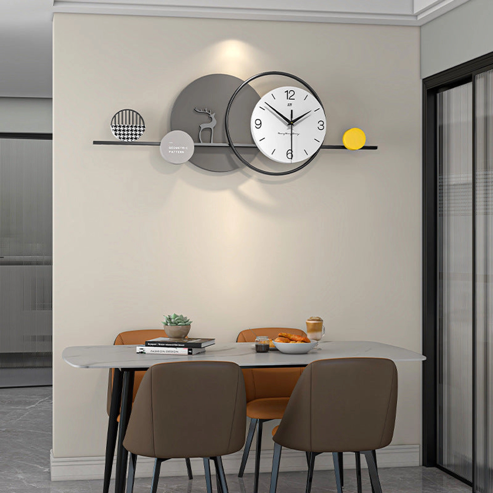 Elevate your home décor with the Modern Geometric Wall Clock, a seamless blend of functionality and minimalist artistry. This unique timepiece features a contemporary design that is both stylish and understated, making it a perfect addition to modern interiors. At the center of this piece is a round white clock face with black numerals and hands, ensuring easy time reading. The clock is set within a sleek black circular frame, which sits atop a thin horizontal black bar, creating a floating visual effect that adds to its modern appeal. The design is enhanced by geometric accents placed strategically along the bar: On the left, a gray circle showcases a subtle deer silhouette, symbolizing elegance and nature. Adjacent to it, a smaller circle with a black and white houndstooth pattern adds a touch of boldness and texture. On the right, a bright yellow circle introduces a playful pop of color, balancing the neutral tones with vibrancy. This wall clock’s monochromatic palette is complemented by the yellow accent, creating a harmonious and visually appealing design. Perfect for living rooms, offices, or any modern space, this clock serves as both a practical timepiece and a sophisticated decorative element. Key Features: Modern Minimalist Design: Clean lines, geometric shapes, and a sleek composition. Artistic Accents: Includes a deer silhouette, houndstooth pattern, and a pop of yellow for visual interest. High-Quality Build: Crafted from durable iron and MDF materials for longevity and style. Versatile Size: Dimensions of 80*28 CM make it ideal for wall décor in various spaces. Functional & Decorative: A perfect blend of utility and modern design, enhancing any interior aesthetic. Additional Information: SIZE: 80*28 CM Material: Iron, MDF. Package Includes : Wall Clock shown in the picture. Note: Actual color may differ a little from the photos.