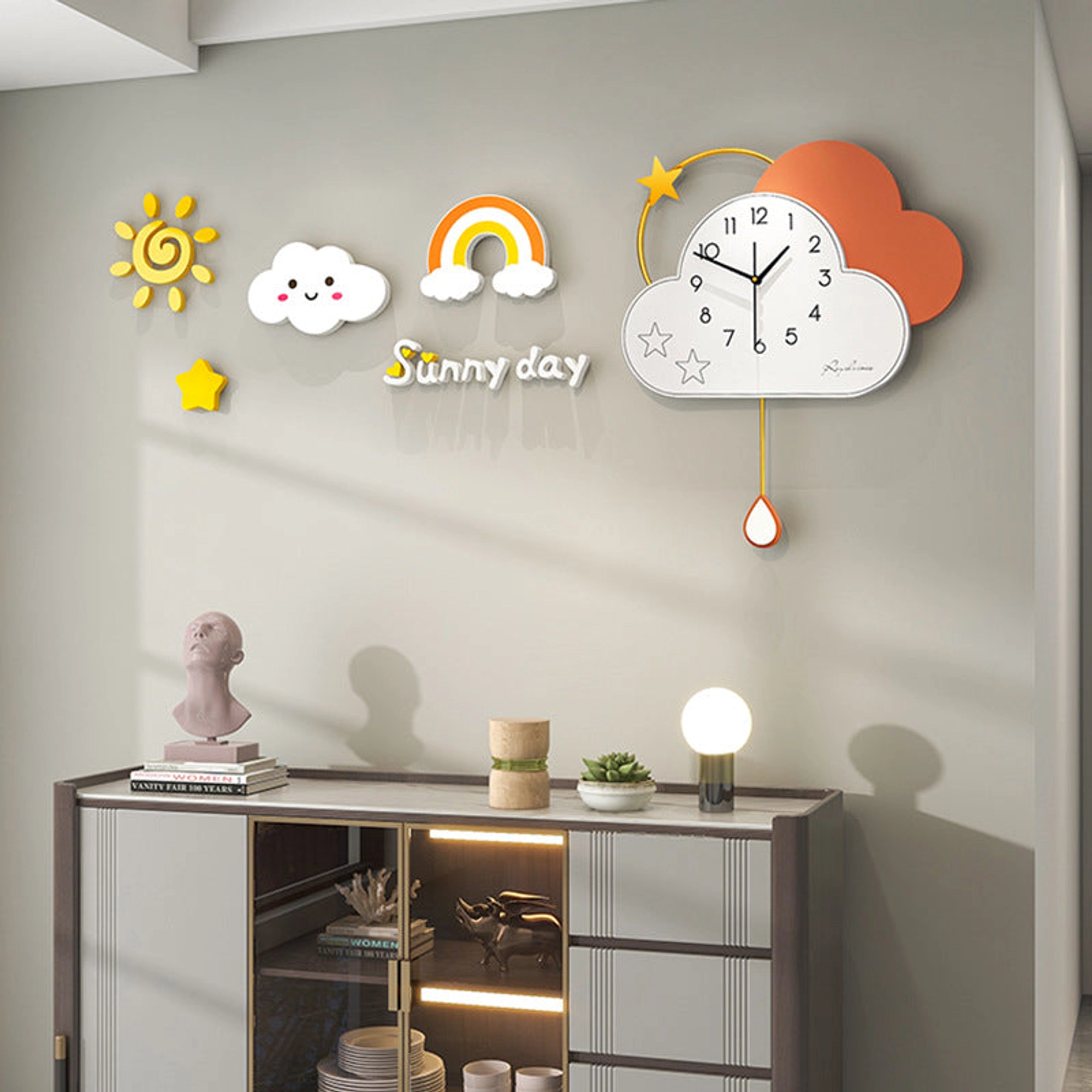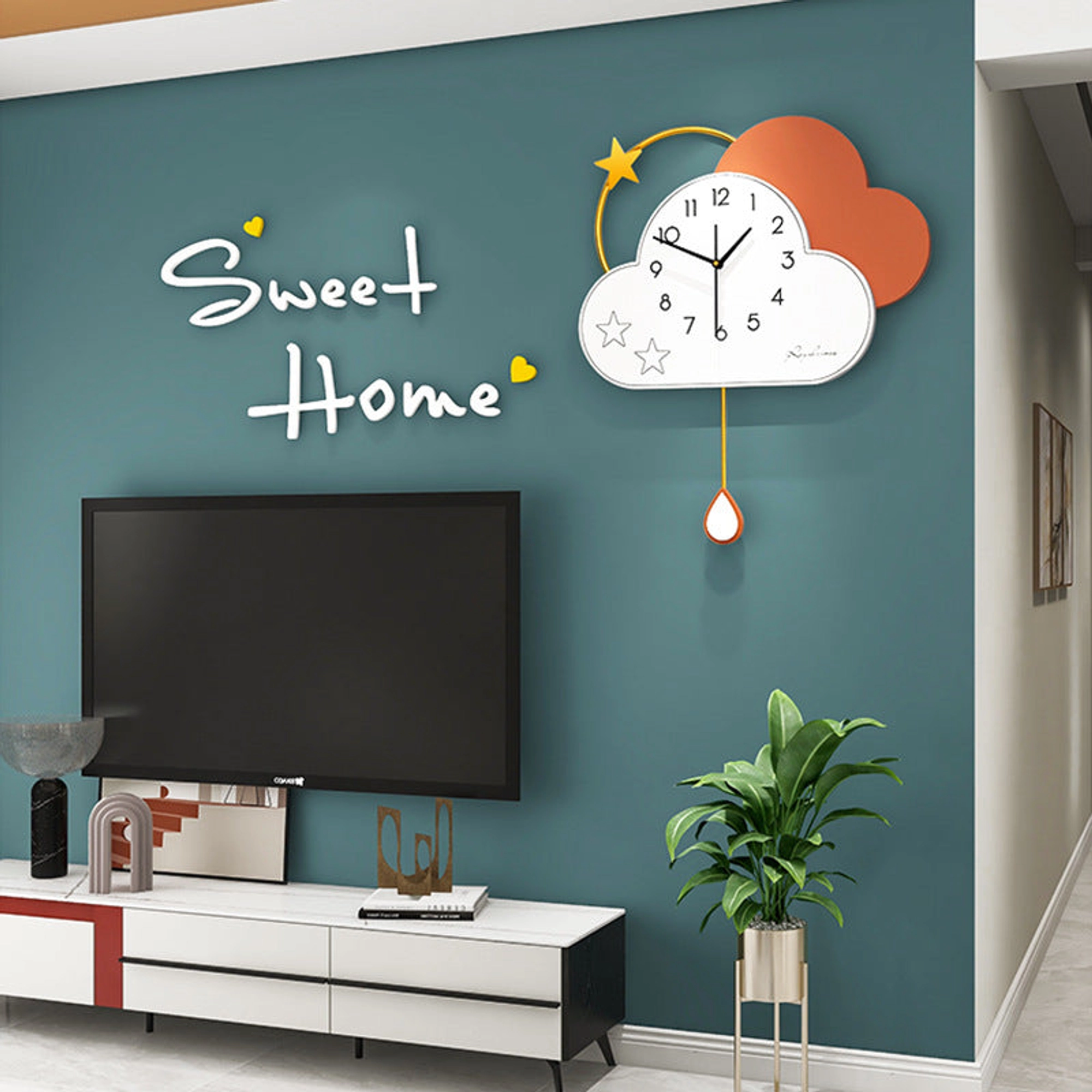 The Whimsical Cloud-Shaped Wall Clock brings charm and whimsy to any room with its soft cloud shape, gold star accent, and pendulum teardrop. Made from iron and MDF, this clock features a simple yet playful design with a white cloud, a gold star, and a light terracotta-colored cloud overlay. The thin, gold pendulum adds movement and elegance, making this clock an eye-catching addition to nurseries or modern living spaces. It measures 53*63 CM and is a delightful way to add both style and function to your walls. Note: Actual color may differ slightly from photos. Key Features: Whimsical Cloud Design: A playful and charming cloud shape, perfect for creating a light, airy atmosphere. Gold Star Accent: A beautiful gold star above the cloud adds a touch of elegance. Pendulum Teardrop: A unique gold pendulum with a terracotta teardrop shape that brings movement to the design. Durable Materials: Made from iron and MDF, ensuring long-lasting quality. Ideal for Children's Rooms: Perfect for adding a soft, whimsical touch to nurseries, bedrooms, or playrooms. Stylish and Functional: Serves as both a functional clock and a piece of modern wall decor. Additional Information: SIZE: 53*63 CM Material: Iron, MDF. Package Includes : Wall Clock shown in the picture. Note: Actual color may differ a little from the photos.